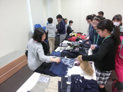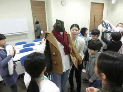 シチュエーションを決めて服を組み合わせていきます。この班は「若かりし頃の校長先生が渋谷に出かける」というテーマだそうです。(笑)
