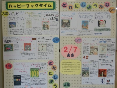 2月7日には「ハッピーブックタイム」が予定されています。いろいろな先生たちが読み聞かせをしてくれる企画です。どの本にするか、選んで聞きに行くのですが、誰が読んでくれるかは当日のお楽しみになっています。