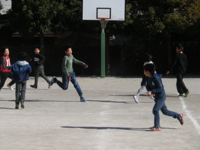校庭でのドロケイ。高学年の子どもは低学年の子どもに合わせて走るスピードを変えています。