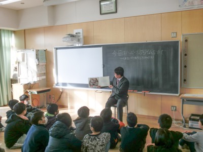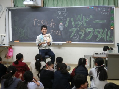5年生向けの本「たなからぼたもち」を楽しそうに読んでくれたのは3-1担任の城鼻先生。