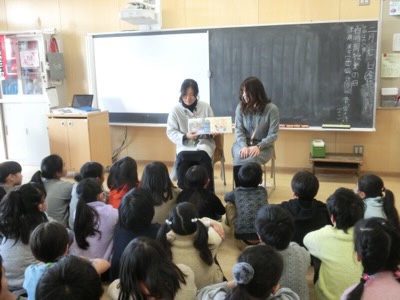 3年生向けの本「うどんのうーやん」は、保健の上農先生と図工の青柳先生が読んでくれました。