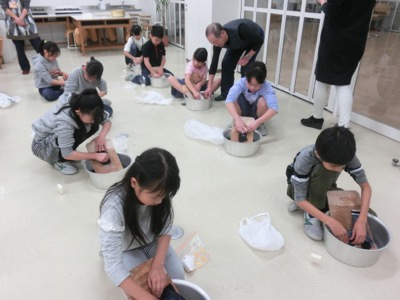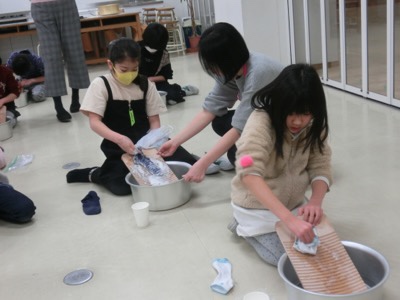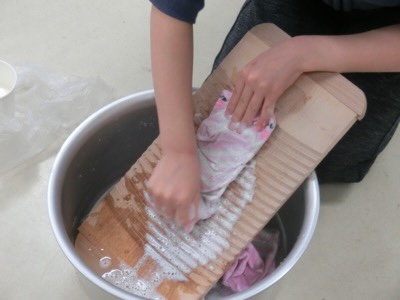 持ってきた汚れた靴下を、慣れない手つきでこすっていました。