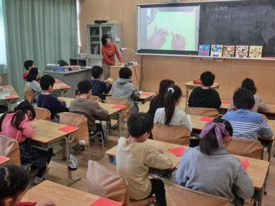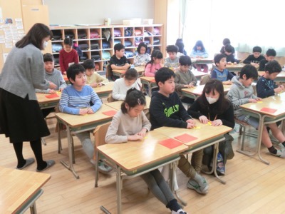 毎月1回の土曜授業では、地域の専門家などゲストティーチャーをお招きする活動が多く行われます。2年生には折り紙の先生が教えにきてくださいました。これは2-2の様子です。