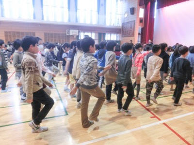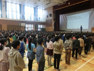 全校朝会に子どもたちが集まってきます。アリーナには行進曲「世界にひとつだけの花」が流れていて、子どもたちは自然と行進曲に合わせてその場で足踏みをして待ちます。