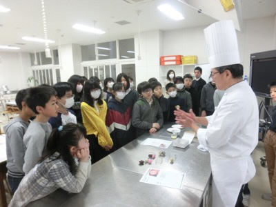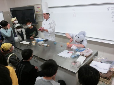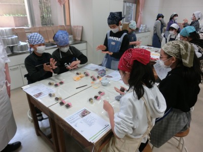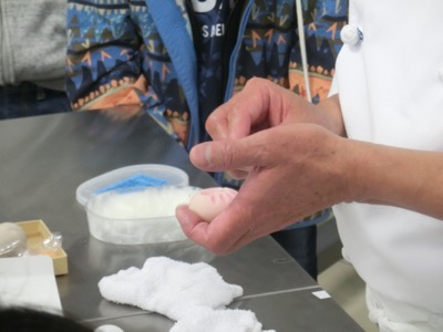 東京製菓学校の梶山校長先生は、和菓子技能試験の審査員をするほどの日本の和菓子業界でトップクラスの先生です。子供たちを前に集めて、作り方を教えてくれています。みんな、興味津々に手元をみています。