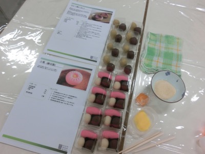 作業台の上に、こんなふうに準備された材料と道具を使って和菓子作りをします。材料や道具は全て東京製菓学校で準備をしてくれました。