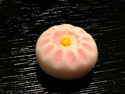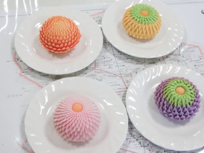 最後に2人の先生が、和菓子作りの高度な技術を見せてくださいました。「はさみ菊」といって、練り切りに切れ込みを入れて菊を作る作業です。和菓子用のハサミを使うやり方と、竹のピンセットのような器具で挟むやり方とを披露してくださっています。