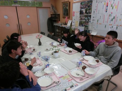 まもなく卒業を迎える6年生との会食が始まりました。今日は6-1の子どもたちが6人...