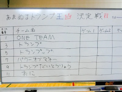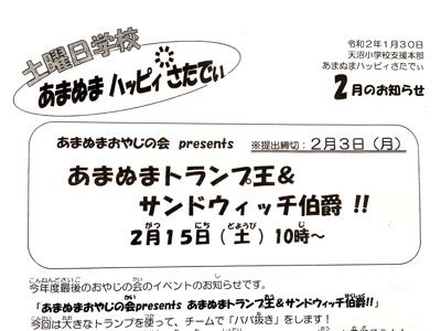 学校支援本部(AW)主催の土曜日学校「あまぬまハッピィさたでぃ(ハピさた)。今月は、あまぬまおやじの会が企画した「あまぬまトランプ王&サンドウィッチ伯爵」です。