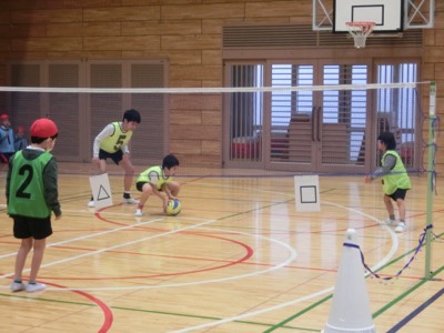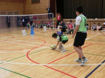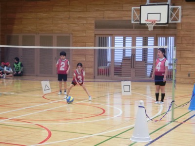 国際競技のフロアボールという名前のスポーツはホッケーのような競技ですが、このフロアボールは「転がすバレーボール」のようなゲームです。3人で協力して、ボールを受け、パスをして、相手のコートに向かってネットの下を転がします。