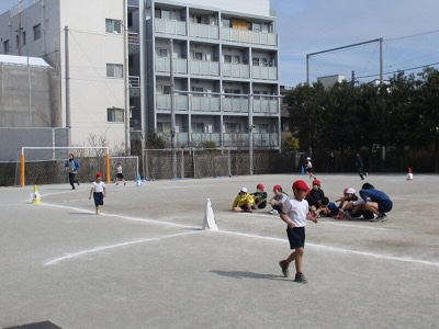 1年生は3分間で何周走れるかを記録します。多い子では1周100mのトラックを6周半も走りました。これはかなり速い方です。