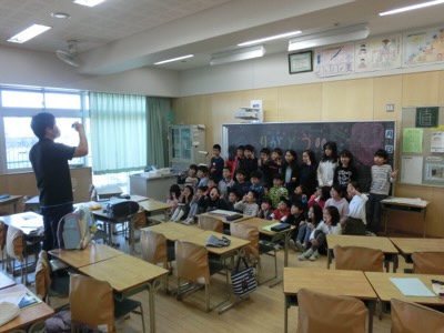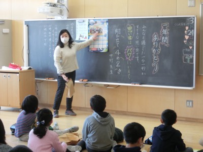 4-2です。5年生になる時にクラス替えがあるので、先生とクラスの子どもたちが一緒に過ごすのは今日が最後です。