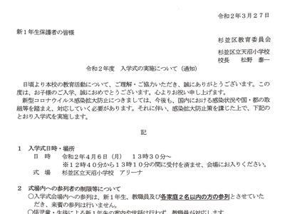 入学式の実施について杉並区から方針が出されましたので、本校の入学式についてホームページにアップしました。↓