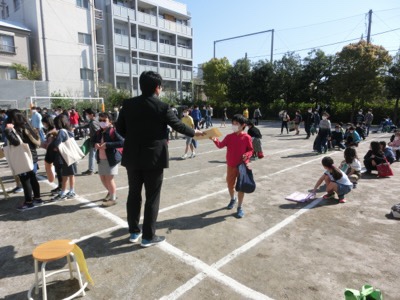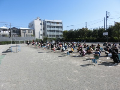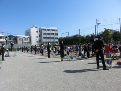 感染防止対策のため、運動会の体操の隊形のように前後左右を大きく空けて並びました。