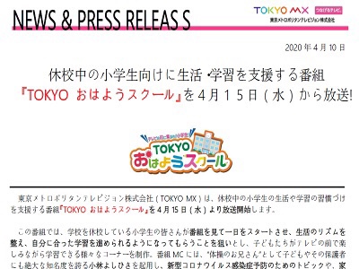 TOKYO MXテレビ(9ch)で、今日から「TOKYOおはようスクール」を放送...