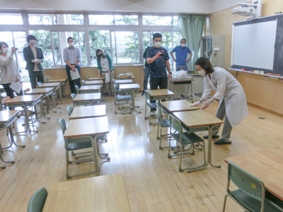 今週の臨時登校日、来週からの学校再開に向けて、さまざまな準備が進んでいます。今日は学校薬剤師の先生を招いて、消毒のやり方について研修を行いました。