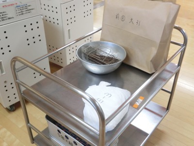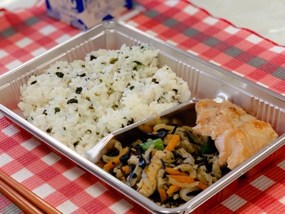 半分の人数なので2クラス分が1つのワゴンに乗せられて運ばれてきます。この3日間は、配膳しやすいようお弁当箱に詰めてもらいました。