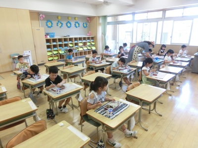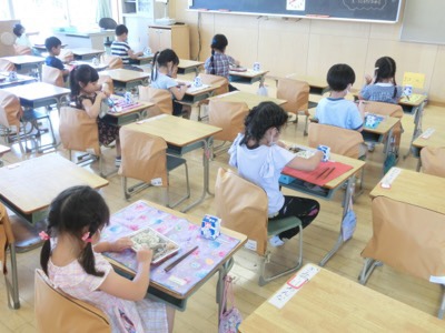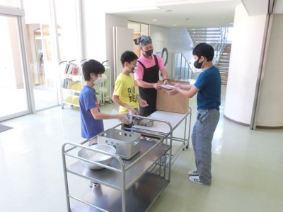 2月28日以来、3か月ぶりに給食が再開しました。感染防止対応のため、通常の給食よりも配膳などが簡単メニューになっています。担任の先生たちがエプロンと三角巾を着けて配ります。