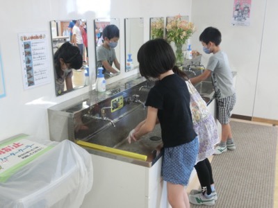 子どもたちは、給食の前後に手をよく洗うように指導されています。