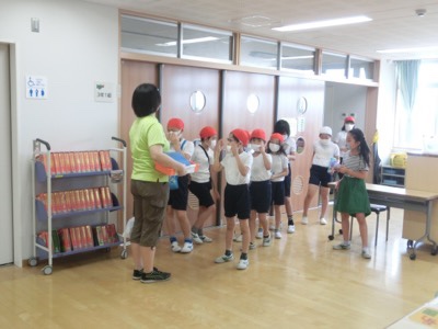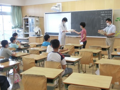 理科専科の高野先生の授業も始まっています。これは5-2です。理科支援員の新井康治先生と2人でプリントを返却していますが、一人ずつ前に出て受け取り、ソーシャルディスタンスを保っています。