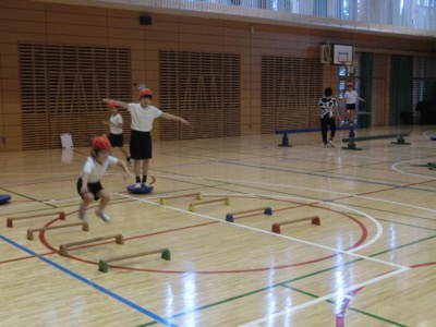 アリーナではこだま学級が体育をしていました。体幹やバランス感覚を鍛える運動です。