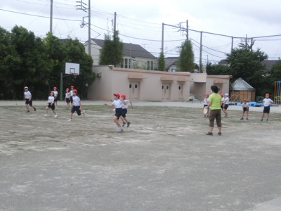 校庭では熱中症防止のためにマスクを外しますが、できるだけ離れて運動します。