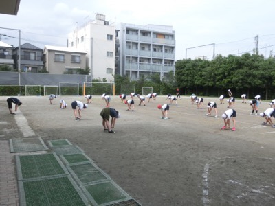 次の時間には5-1が天沼エクササイズをして体をほぐしていました。3か月間の休校で、運動不足になっている子も多いようです。