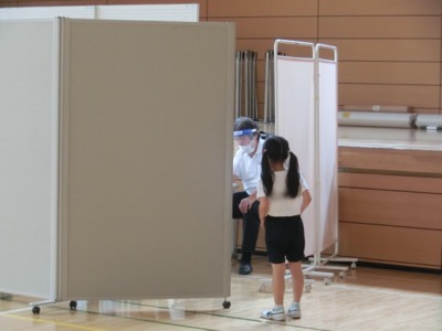 学校が再開して3週間が経ちました。健康診断も徐々に進んでいます。今日は内科検診。保健室ではなく、広いアリーナにパーテーシも離れてョンを組んで実施します。順番を待つ子どもたちも離れて並びます。これは1-2です。