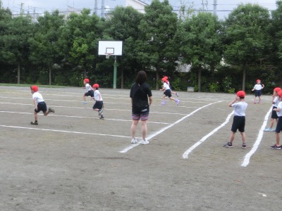 校庭では1-3が体育をしていました。並んで、スタートの合図でまっすぐ走り出す練習です。