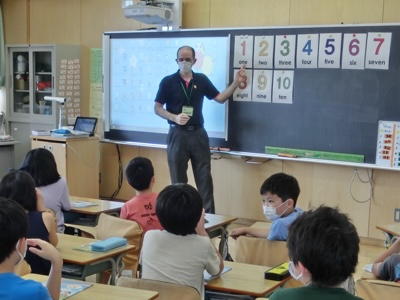3-2はALTのギャビン先生の英語活動です。今日は数字を英語で言っていくゲームをしていました。