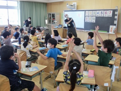 今日の授業風景は3-3の音楽から。1学期の間、音楽の授業は感染防止のために歌やリコーダーができません。今日は講師の會田先生が「春の小川」のメロディを教えていました。子どもたちはマスクの中で軽くハミングをして音程を確認しています。