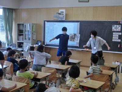 象(elephant)の動きを身体で表現しています。英語活動は身体を使って親しんでいくのがいいようです。