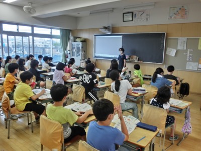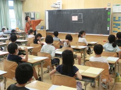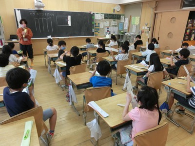 2-3は講師の會田先生が図工でたなばた飾りを作る授業をしていました。