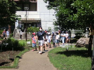 弁天池公園です。担任の先生だけでなく、学校支援本部(AW)のみなさんが付き添ってくれています。