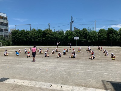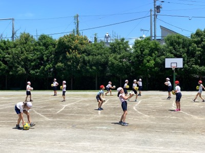 ボールを使った運動ですが、間隔を空けるだけではなく、感染防止で用具の使い回しができないため、自分で投げ上げたボールを自分で取る運動しかできません。それでも工夫して楽しく運動しています。