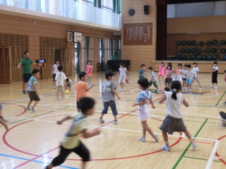 アリーナで2-4が体育をしています。音楽に合わせて体を動かす運動です。