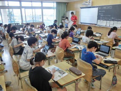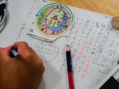 6-4は社会科の授業で新聞作りをしていました。歴史の学習に入り、縄文時代、弥生時代、古墳時代を学んだところでまとめをする学習です。