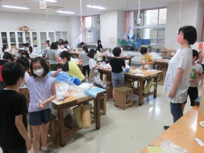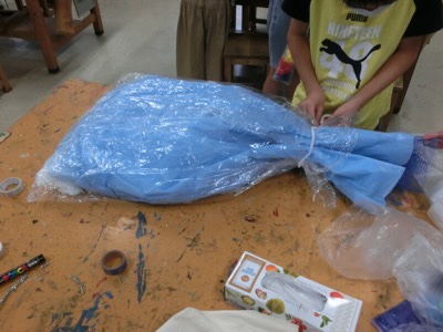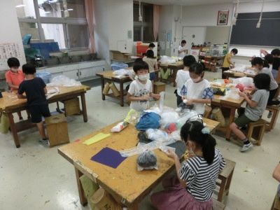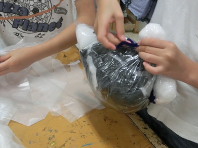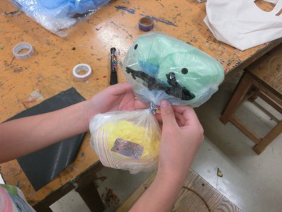 ビニール袋の中に綿や紙を詰めて動物を作っているようです。