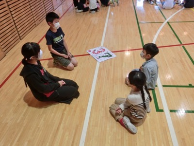 例年であれば、1年生は「1年生を迎える会」で全校の子どもたちから歓迎され、6年生にお世話されたり、「たてわり班」で他の学年の子どもたちと遊んだりするのですが、今年は感染防止のため交流の機会がありませんでした。今日はアリーナでなるべく間隔を空け、1年生と6年生が対面しました。