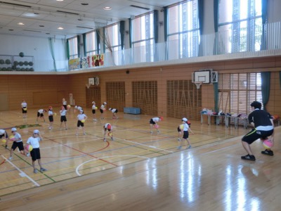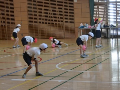 アリーナでは3-3が体育をしています。一人一つボールを持って、股の間を潜らせてボールを動かす運動です。