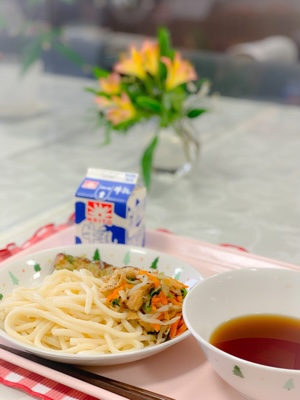 おまけの画像は今日の給食。冷やしきつねうどんです。夏メニューですね。