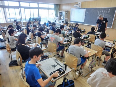 5-2は、稲垣先生による毛筆書写の授業です。「友達」という字を書いていました。「達」のシンニュウが難しいようです。
