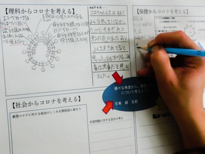 昨日は、理科専科の高野先生が理科の視点からコロナウイルスの構造や菌との違いについて教えてくれました。また、社会科では今回の感染症対策について国や地方自治体の政治の働きについて学んでいます。子どもたちは学んだことをワークシートにまとめていました。
