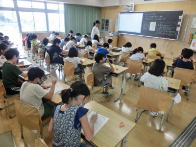 3-2では、夏休みの宿題の成果をプリントで確認していました。