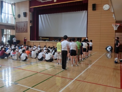 6年生は「学年別運動会」に向けてアリーナで始動しました。揃って動くことの基本を確認していました。