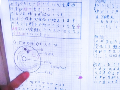 ノートのまとめ方の良い点について、例を見せながら説明しています。良いものを見て学ぶのは大切なことです。