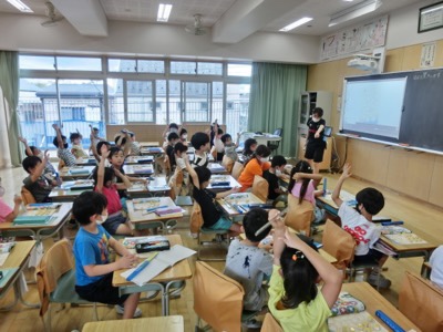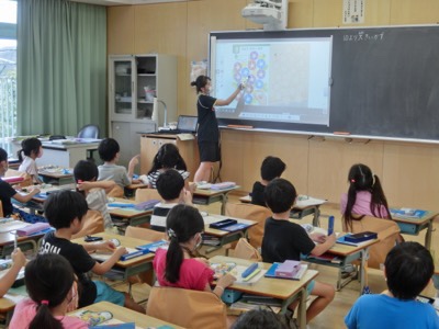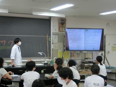 理科室では5-2の理科の授業。理科専科の高野先生が子どもたちのノートを大画面に映していました。
