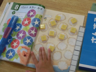 教科書の貝のイラストをブロックを載せて数えるのですが、10個のブロックをでは足りません。
