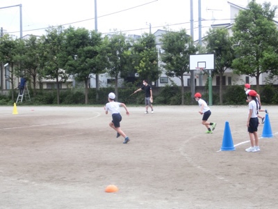 昼前に一雨降って、午後はまた晴れました。6年生が80m走の練習でゴールを駆け抜けていました。