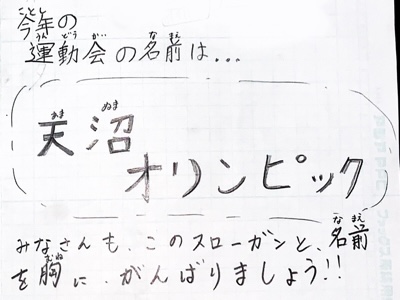 代表委員会の子どもたちで話し合い、学年別運動会を「天沼オリンピック」と命名しました。